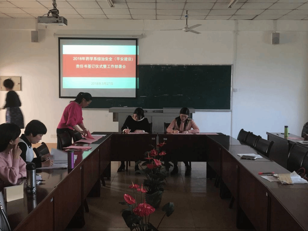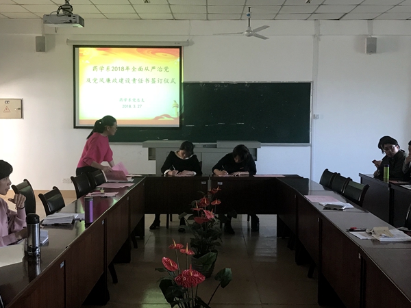 3月28日下午,药学系在致远楼512会议室举行2018年全面从严治党及党风廉政建设暨综治安全(平安建设)工作目标管理责任书签订仪式。系班子成员、全体教职工参加了签订仪式。系主任杨丽珠主持。