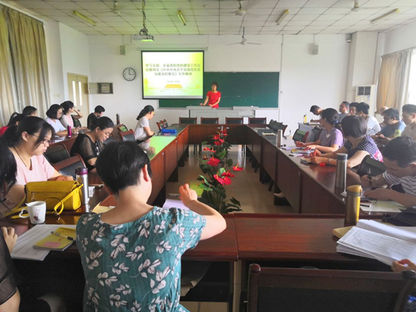 7月5日下午,药学系党总支在致远楼512会议室组织全体教职工学习全国、全省高校党的建设工作会议精神及《中共中央关于加强党的政治建设的意见》文件精神。会议由系党总支副书记主持,党总支书记主讲。