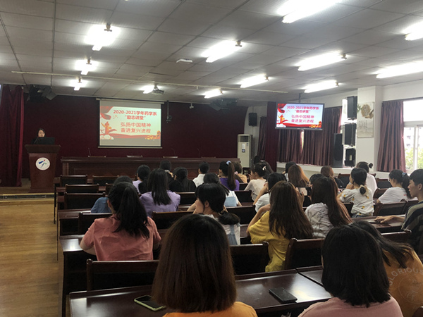 为探索和创新大学生思想政治教育工作的新渠道和新方法,帮助学生汲取正能量、坚定理想信念、树立远大理想,10月13日下午,药学系在明诚楼演播厅开展了以《弘扬中国精神 奋进复兴进程》为主题的励志讲堂活动。活动由辅导员黄艳菁老师主持,系“五四”先进工作者陈柯帆同学主讲。2019级高职药学四班全体同学参加本次励志讲堂。