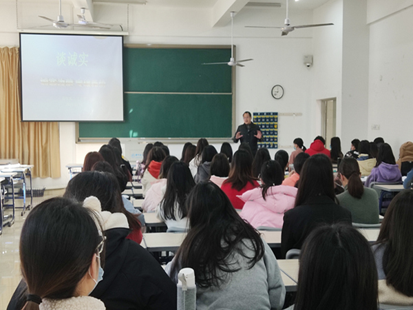 为了教育和引导学生弘扬诚信美德,营造优良学风,1月12日上午,药学系主任王小平走进厚德楼104,围绕“谈诚实”这一主题,为挂钩联系的2019级中药学三、四班上了一堂生动的思政课。