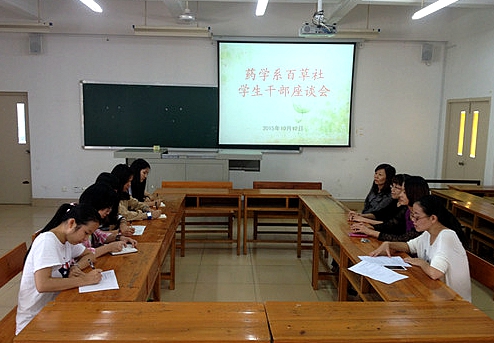 10月12日下午,药学系在致远楼309室召开百草社成立后的首次学生干部座谈会。系党总支副书记陈美燕、中药教研室主任陈育青及尤淑贤老师应邀出席会议。五名社团学生干部参加了此次会议。