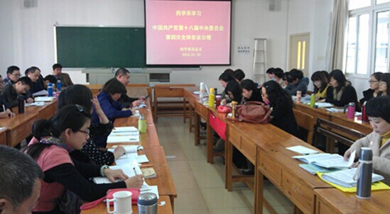 1月20日下午,药学系在致远楼308室组织全体教职工学习《中国共产党第十八届中央委员会第四次全体会议公报》,对党的十八届四中全会全面推行依法治国,建设法治政府的主题进行全面的学习理解。会议由系总支书记主持。