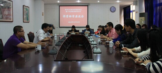11月13日上午,药学系与厦门九鼎药房有限公司在行政楼五楼会议室举行校企合作捐资助学座谈会。药学系领导班子、厦门九鼎药房有限公司董事长一行五人,以及受该企业资助的药学系13级和14级的二十名学生参加座谈。