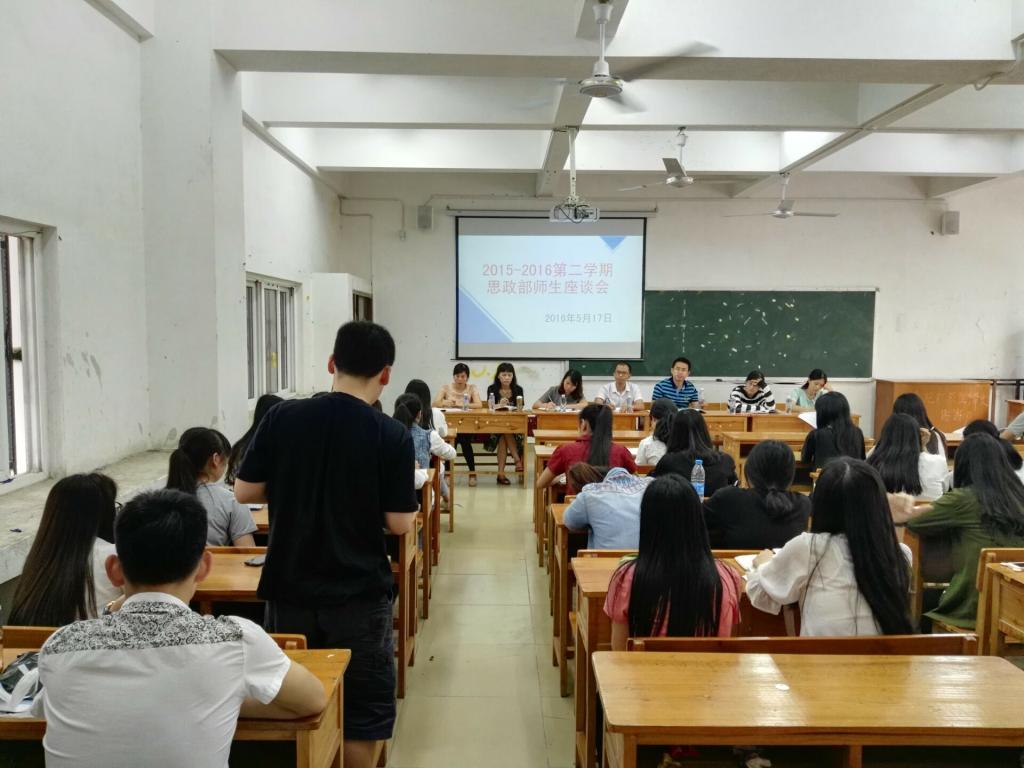 5月17日下午,思政部在明诚楼104室举行2015-2016学年第2学期师生座谈会,各教研室主任、教师代表及学生代表参加。思政部负责人方鑫老师主持。