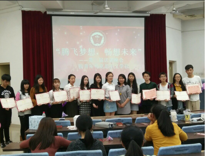 4月14日晚,院青年马克思主义学社在明德楼三教举办了"腾飞梦想,畅想未来"送老晚会,指导老师黄老师以及青马学社全体成员均到场参加。