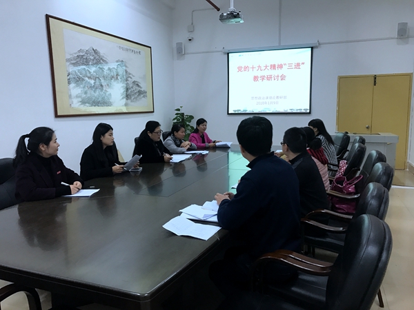 2018年1月9日下午,党的十九大精神“三进”教学研讨会在图书馆会议室召开,思政部负责人、教研室主任及教师参加研讨。