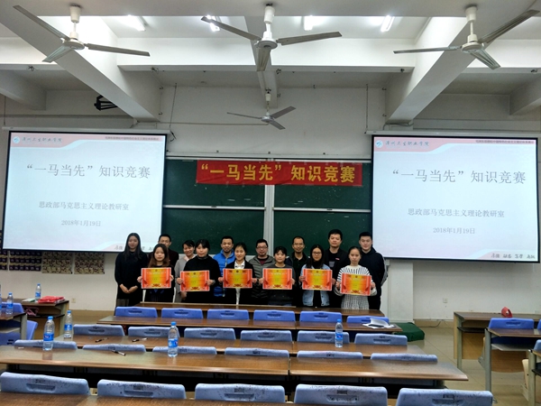 1月19日晚上,由思政部主办、马克思主义理论教研室承办的“一马当先”知识竞赛决赛在明德楼2教举行,院党工部负责人、教研室主任、教师及部分学生参加。