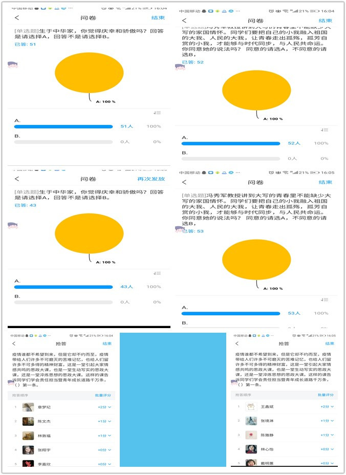 课后,思政课教师结合课程和开学第一次课关于感悟和思考中进行的爱国主义教育、生命教育、规则教育、社会责任感教育、爱与感恩教育,通过学习通、微信等线上平台,组织学生在线进行了讨论,并开展了问卷、抢答等活动,我院学子热议思政大课,纷纷感到生于中华家,是值得庆幸和骄傲的;认为作为国家的一分子,爱国是最大的责任担当;表示身为医学生,要努力学好本领,学好专业技术,继承先辈的衣钵,把自己成就为一名有理想、有本领、有担当的时代新人,为祖国奉献自己的一份力量。