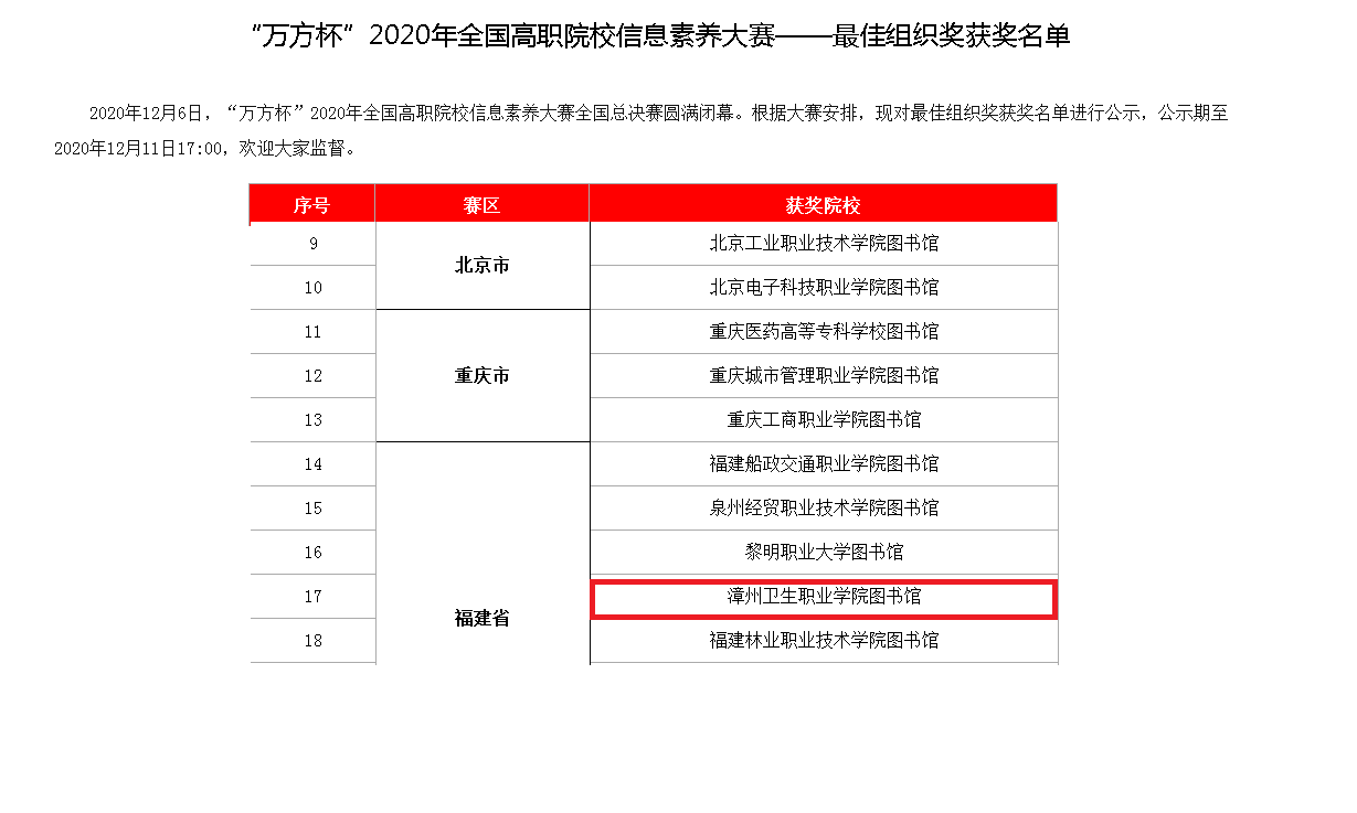 近日,“万方杯”2020年全国高职院校信息素养大赛全国总决赛圆满闭幕。本次大赛全国共有715所高职院校、104万余名学生参赛,我院图书馆荣获全国高职高专“最佳组织奖”;在福建省赛区中荣获九个奖项:教师微课赛二等奖2名,三等奖2名,学生赛优秀奖1名,优秀指导老师奖3名、优秀组织奖,其中有2名学生成功入围全国赛。