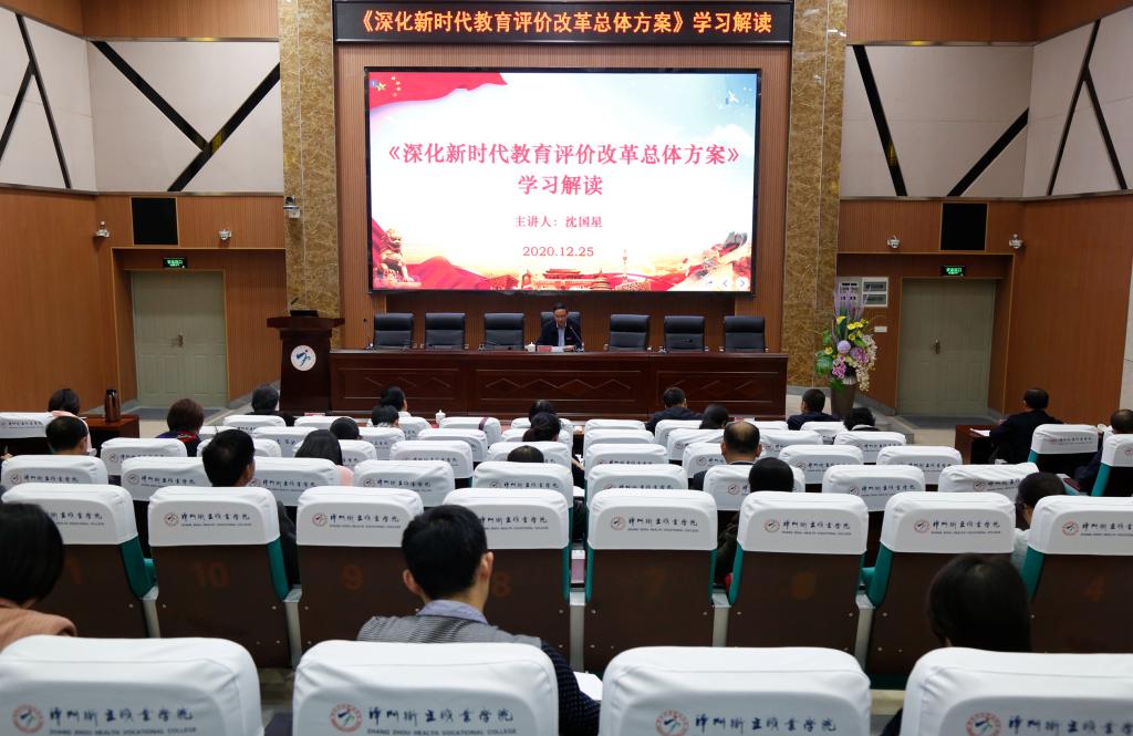 为深入宣传学习中共中央、国务院《深化新时代教育评价改革总体方案》,切实做好教育教学工作。12月25日下午,我院在学术报告厅组织学习《深化新时代教育评价改革总体方案》。学院领导班子及副科以上干部参加,院长沈国星做专题解读。