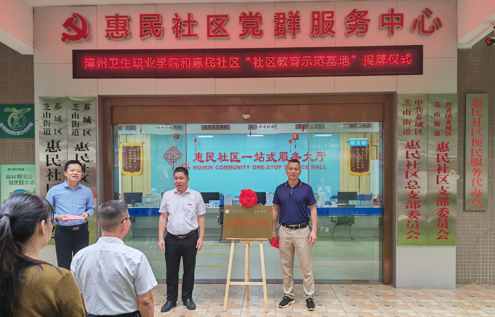 陈义三与惠民社区、北桥社区党政领导共同为“社区教育示范基地”进行揭牌、授牌。为进一步提升社区教育服务能力,陈义三就社区教育示范基地建设进行调研。调研会上,社区相关工作人员对我校近年来开展的社会服务表示感谢和认可,通过专业的师资队伍开展健康教育活动、普及健康生活知识等,有利于提高居民健康素养水平和生活质量。