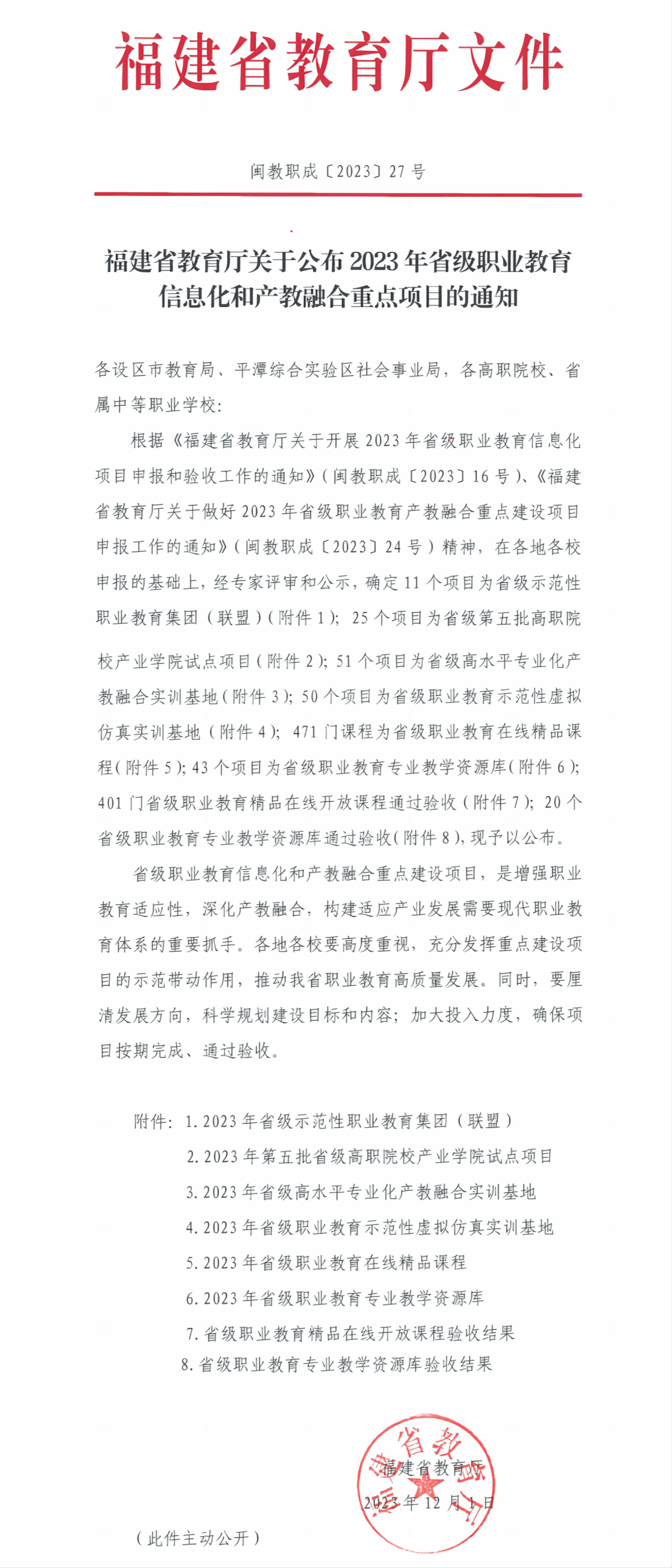 近日,福建省教育厅发布《福建省教育厅关于公布2023年省级职业教育信息化和产教融合重点项目的通知》(闽教职成[2023]27号),我校17个项目进入认定(验收通过)名单。