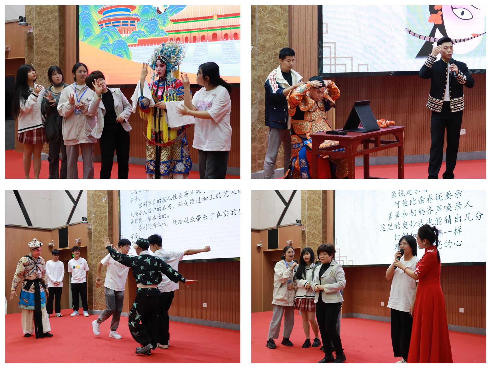 福建京剧院优秀青年演员为我们带来了《贵妃醉酒》《三岔口》《茉莉花》《红灯记》选段和《江姐》选段等精彩演出,他们的唱、念、做、打,一招一式,为我们诠释了“台上一分钟,台下十年功”的魅力。现场还设置了互动环节,老师和同学们的参与热情高涨,纷纷上台体验,在演员们的引导和指导下,师生学习、模仿了一些经典的京剧唱段、动作,更近距离地了解和感受国粹京剧的魅力。