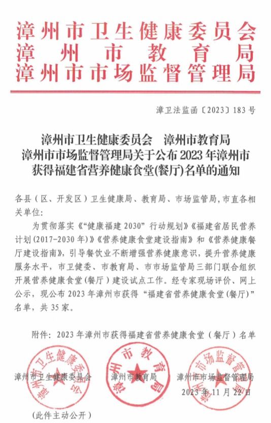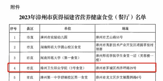 近日,在漳州市卫生健康委员会、漳州市教育局、漳州市场监督管理局联合公布了《2023年漳州市获得“福建省营养健康食堂(餐厅)》,我校3号食堂荣获“2023年福建省营养健康食堂(餐厅)”称号。