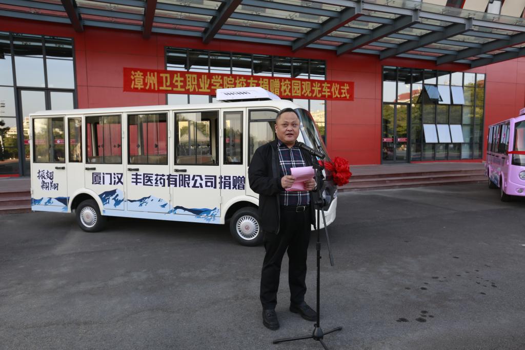 12月8日下午,我院87届中药剂专业校友、福建省华成医药有限公司董事长陈应权和93届医士专业校友、厦门汉丰医药有限公司董事长肖汉章重返母校,向学院捐赠电瓶车2部,表达对母校的感恩之情。捐赠仪式在体育艺术中心举行,学院党委书记林忠,原漳州卫生职业学院副书记、副院长林永富,副院长沈小美、蔡韶滨,校友会理事及学生代表共百余人参加,仪式由校友会会长主持。