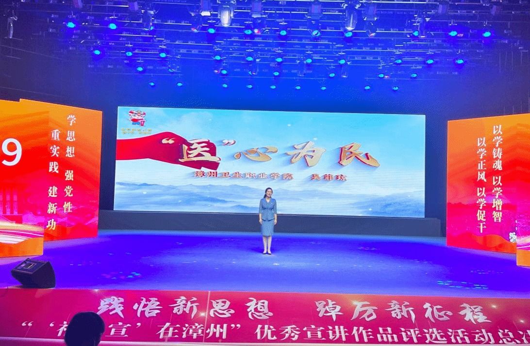 12月1日,“‘福小宣’在漳州优秀宣讲作品评选活动总决赛”在漳州电视台演播大厅举行。我校吴菲琼老师宣讲的作品“‘医’心为民”荣获三等奖,学校被授予“优秀组织奖”。