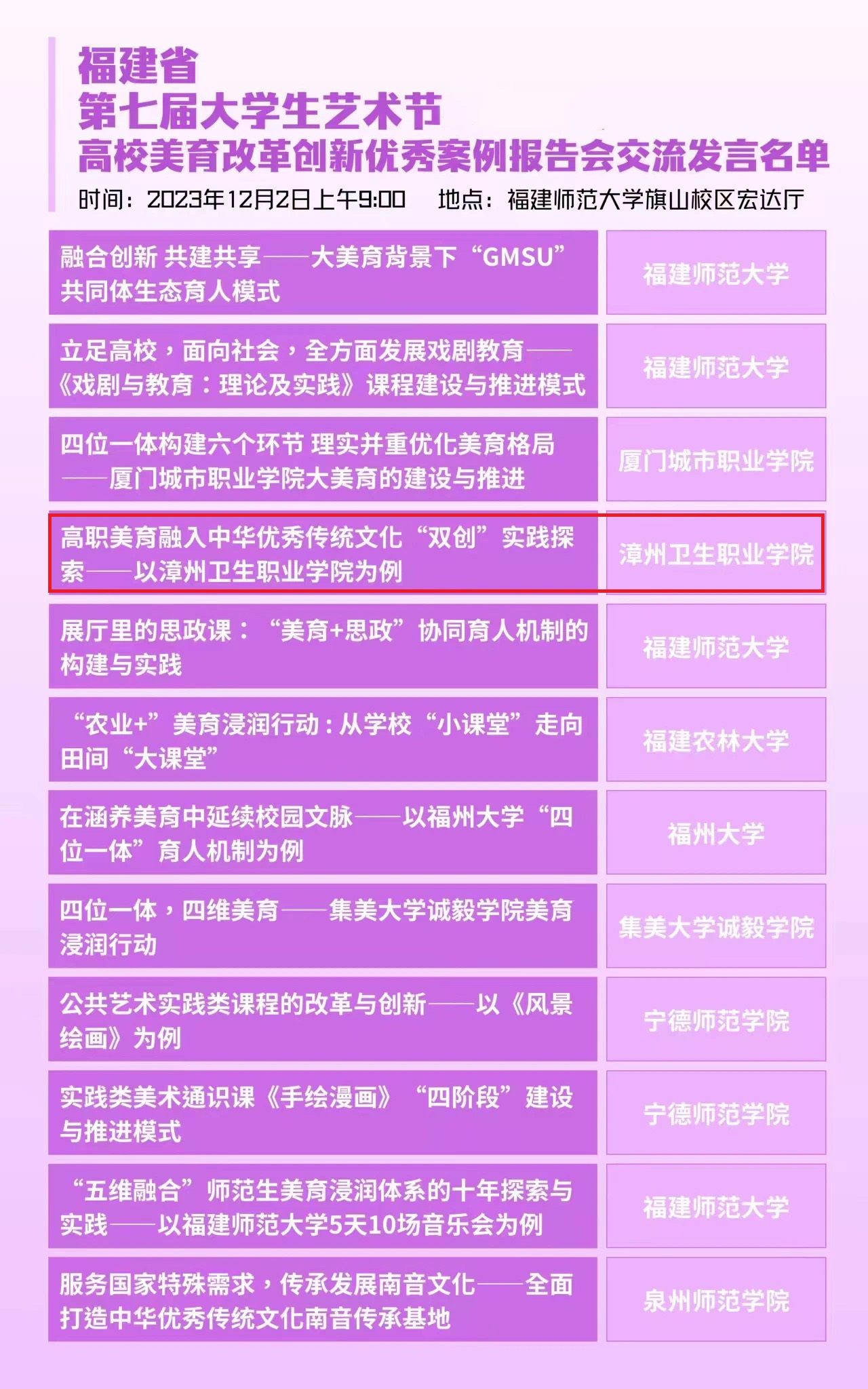 近日,福建省第七届大学生艺术节公布了高校美育改革创新优秀案例名单,我校选送的《高校美育融入中华优秀传统文化“双创”实践探索——以漳州卫生职业学院为例》美育案例成功入选。