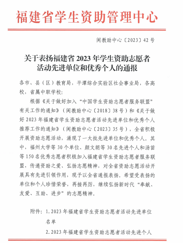 12月18日,福建省学生资助管理中心发布《关于表扬福建省2023年学生资助志愿者活动先进单位和优秀个人的通报》,我校获评“先进单位”称号(全省共30个)。