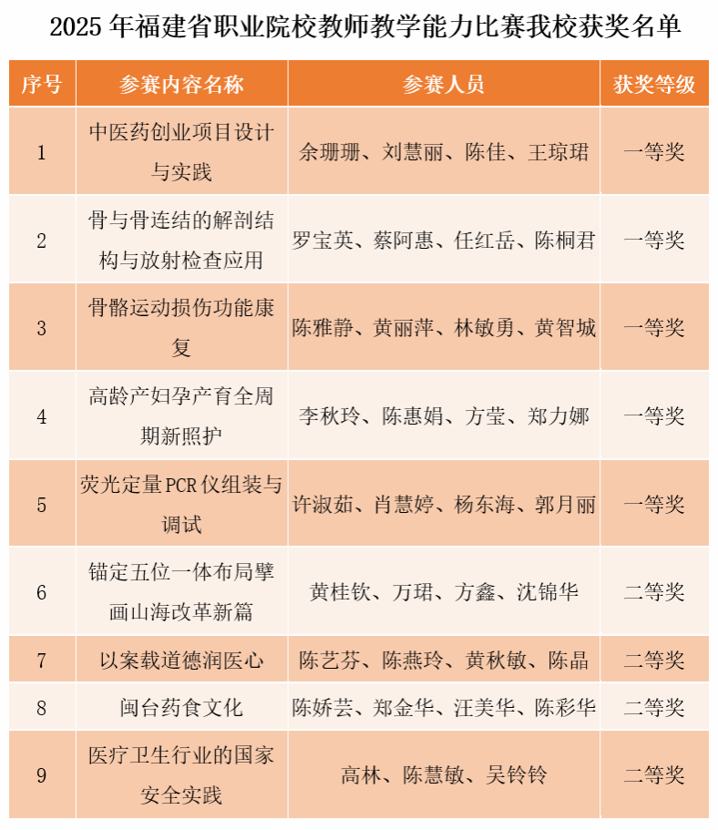 2025年福建省职业院校技能大赛教学能力比赛圆满落幕,我校教师团队凭借扎实的专业素养、创新的教学设计和出色的现场表现,在全省众多参赛队伍中脱颖而出,斩获一等奖5项、二等奖4项。其中,专业组参赛团队均荣获一等奖,创下我校在该项赛事中的历史佳绩,充分展现了我校教师队伍的教学实力与育人风采。