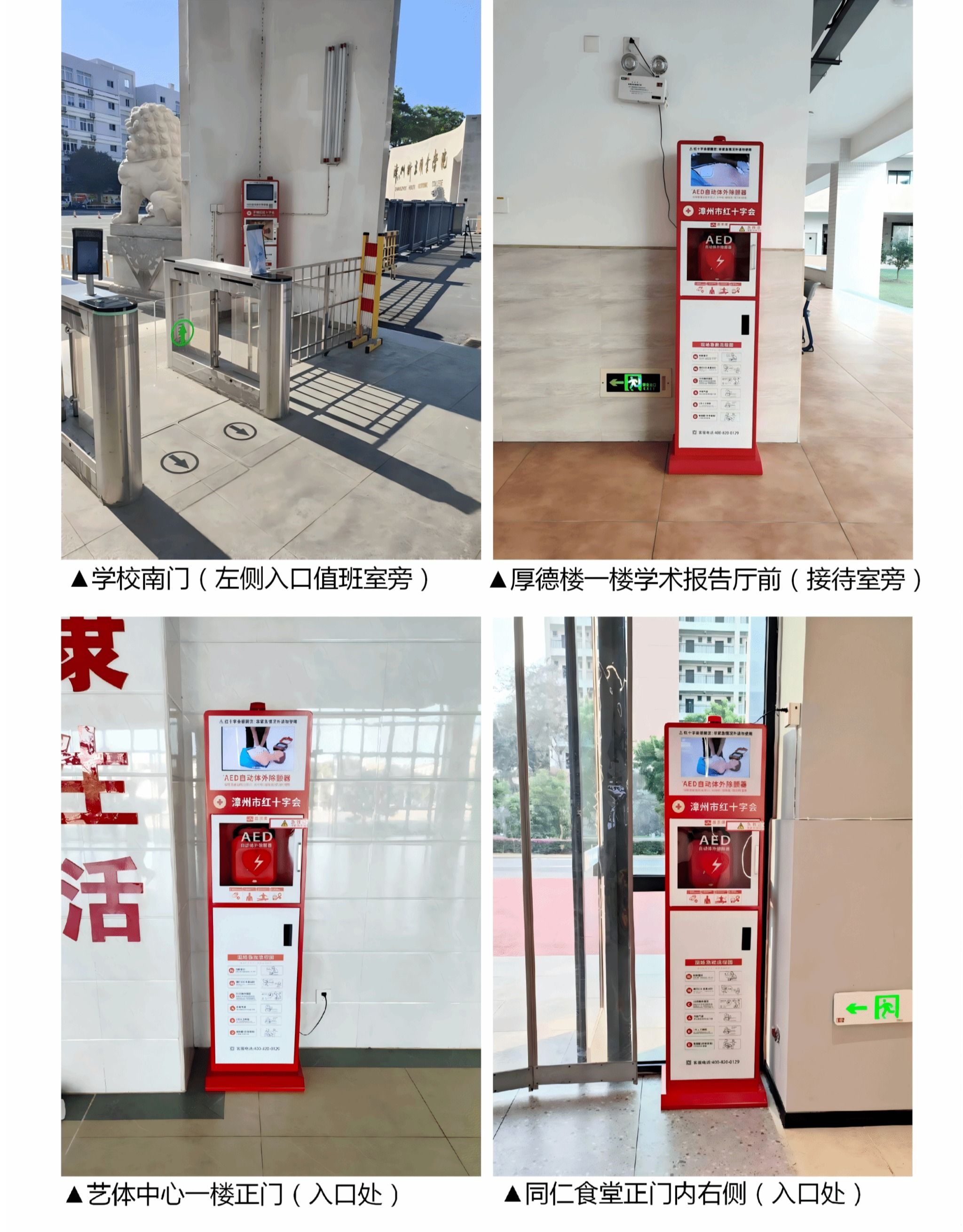 此次AED设备布局充分结合校园人流分布与师生活动特点,实现关键区域全面覆盖:学校南门作为师生入校主要通道,厚德楼学术报告厅是大型活动常用场所,艺体中心承载日常体育教学与运动健身需求,同仁食堂则是师生就餐核心区域。四大点位精准覆盖学习、生活、运动等高频场景,构建起“就近获取、快捷使用、有效施救”的校园应急救助网络,让应急保障触手可及。