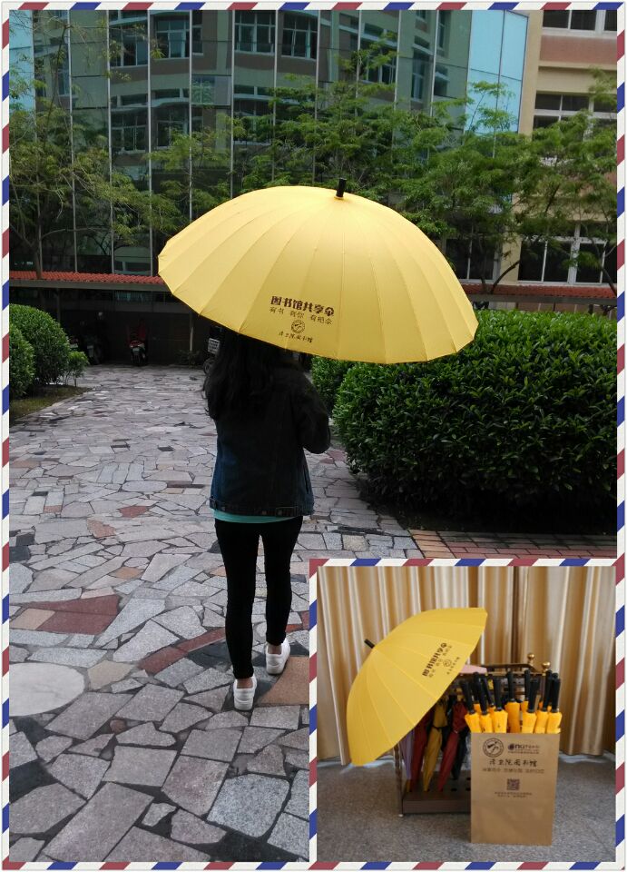 图书馆 “爱心伞”服务一年来,倍受广大读者欢迎,由于使用频率较高,出现部分损坏,在“4.23”世界读书日之际,恰逢中国知网在福建省5所高校(本科院校3所,高职院校2所)开展“爱心伞”馈赠活动,我院很荣幸成为“爱心伞”馈赠一员,添置了30把印有漳卫院图书馆专属LOGO新的“爱心伞”,“爱心伞”不仅用于遮雨挡阳,更传递着图书馆对读者的关爱,体现以人为本的服务理念,让爱在 “爱心伞”间传递,让温暖流淌在每位读者的心里。相信图书馆的“爱心伞”一定会成为校园流动着的一道亮丽的风景线。