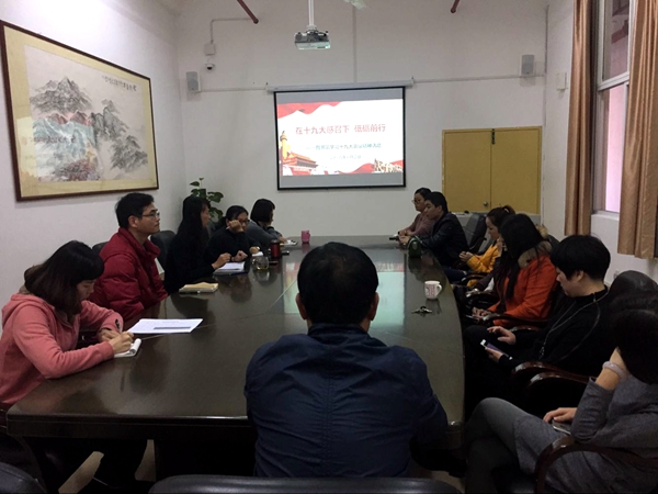1月2日下午,图书馆组织全体馆员在会议室集中学习党的十九大报告,馆长主持会议,由馆办主任带领大家学习党的十九大内容,他以新时代中国特色社会主义为切入点,着重从深刻变革、伟大实践、理论指导、基本方略、战略安排、行动纲领、坚强领导等七方面进行深刻讲解。