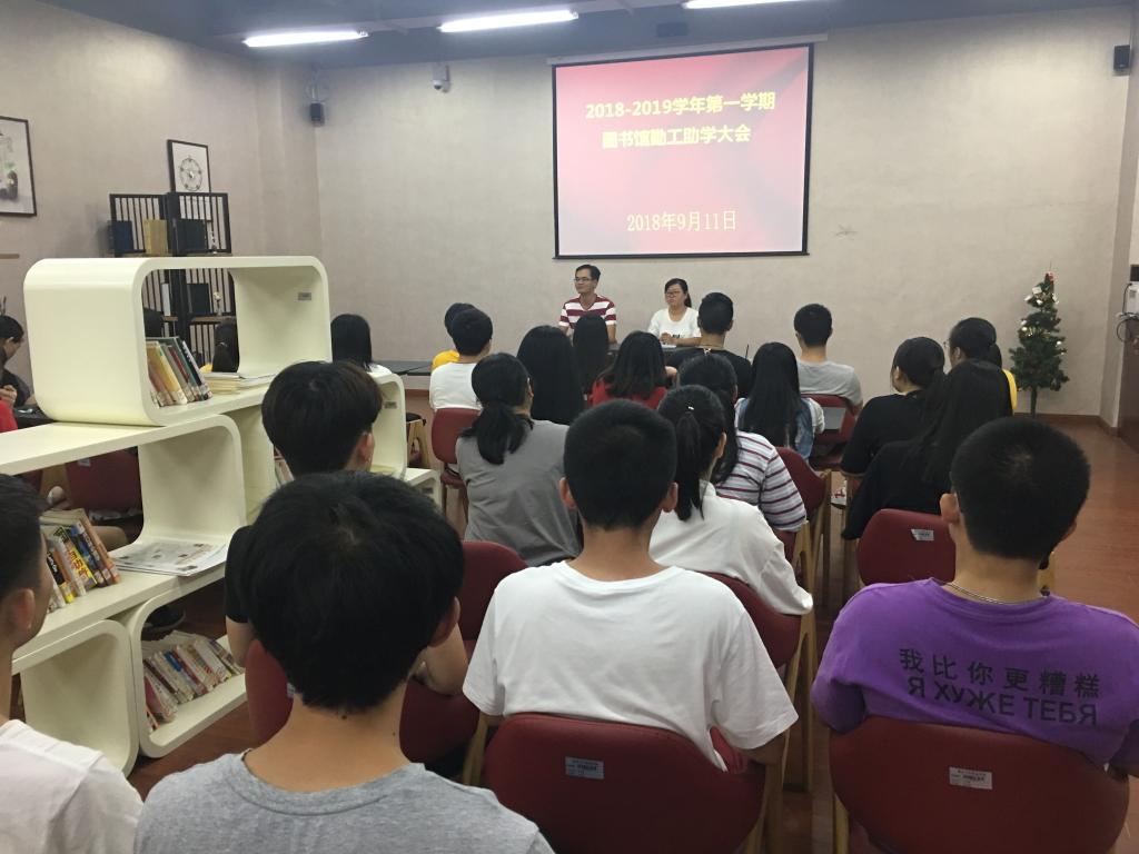 在会上,馆办主任首先对勤工助学学生付出辛勤的劳动表示感谢,鼓励学生积极参加勤工助学实践锻炼,提高自身综合素质,为将来走进社会打下良好的基础。接着,他对新学期勤工助学工作做出了安排。
