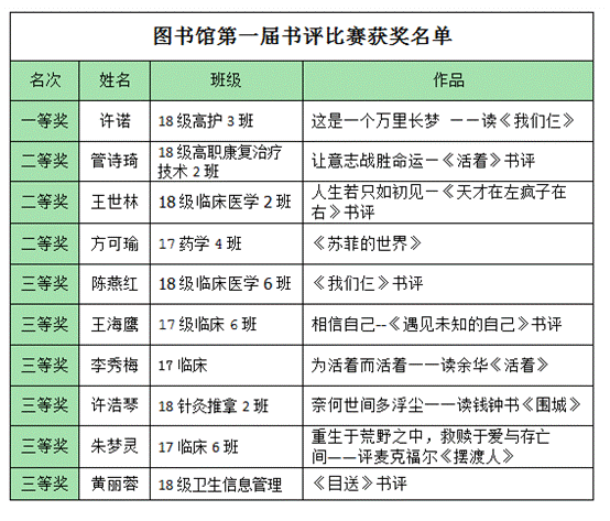 近日,图书馆第一届书评比赛,暨 “书香卫院 悦读悦美”2019读书节系列活动之一圆满结束。本次比赛是“不忘初心,牢记使命,八闽大地,阅读前行”第三届福建省大学生书评大赛的预备赛,面向全校读者征稿,共征集书评百余篇。比赛要求读者赏书评书,以书籍中心主旨与阅读感悟相结合的形式,撰写原创书评。经过学术不端系统检测、专业评委进行评选,10篇主题鲜明、措辞优美、立意深远的文章脱颖而出,甄选出一、二、三等奖。其中,18级高护3班许诺的《这是一个万里长梦—读<我们仨>》荣获一等奖。