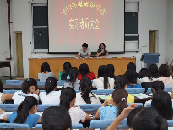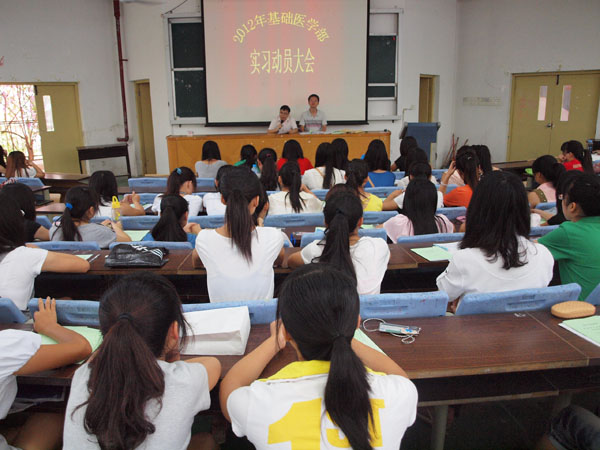 6月5日下午16:15分在明德3教,基础医学部召开了下临床学生实习动员大会。基础医学部主任唐忠辉教授、党总支副书记颜晓星副教授、团总支书记练建斌老师、各班辅导员和实习带教老师,以及下临床班级共200多位同学一同参加了动员大会。会议由练建斌书记主持。