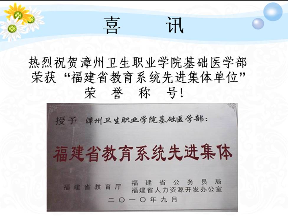 热烈热烈祝贺漳州卫生职业学院基础医学部荣获“福建省教育系统先进集体单位”荣誉称号