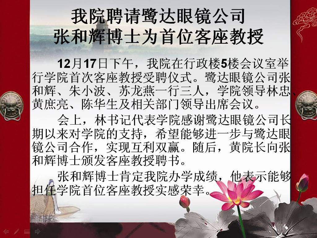 我院聘请鹭达眼镜公司张和辉博士为首位客座教授