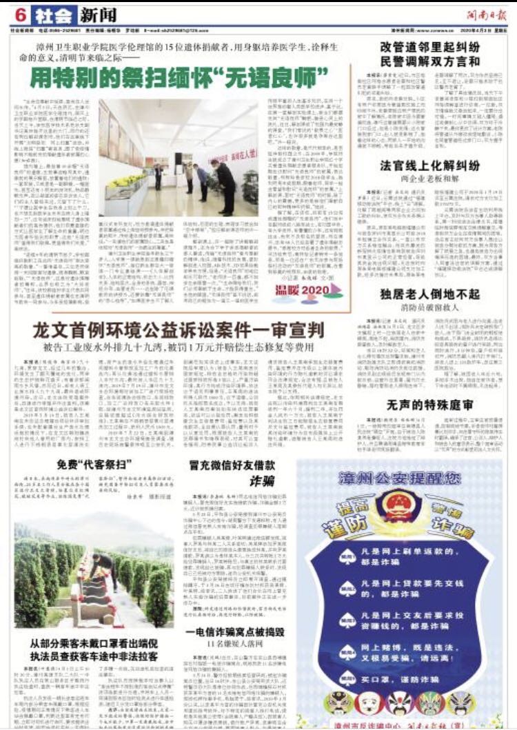 4月3日《闽南日报》第六版社会新闻版,报道我院用特别的祭扫缅怀“无语良师”。在漳州卫生职业学院的医学伦理馆有15位遗体捐献者,他们用身躯培养医学生,诠释生命的意义。