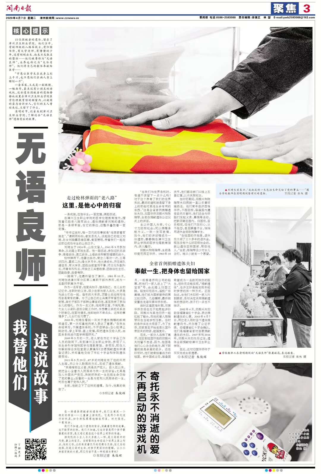 4月7日,《闽南日报》第3版专版报道了我院部份遗体捐献者的故事。15位捐献者的遗体,留在了漳州卫生职业学院。他们当中,有副师级的八路军战士,有归国华侨,有大学老师,有懵懂的少年,还有刚刚出生、尚来不及取名的婴孩……他们被尊称为“无语良师”,业界也称之为“大体老师”。他们将自己的躯体奉献给医学——