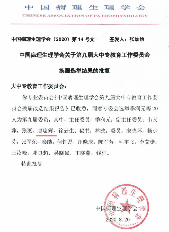 2020年中国病理生理学会大中专教育工作委员会换届选举工作如期举行。经选举,我院唐忠辉教授当选为第九届委员会的副主任委员。