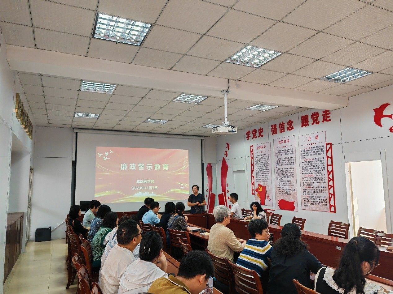 为深入推进新时代廉洁文化建设,推动全面从严治党和党风廉政建设工作向纵深发展延伸,持续推动主题教育走深走实。11月7日下午,基础医学院在明智楼401会议室召开全院党风廉政警示教育大会。全院教职工集体观看廉政教育系列参考片《蚁贪之害——基层干部违纪违法案件警示录》,之后学院党总支书记陈雅静作强调讲话。