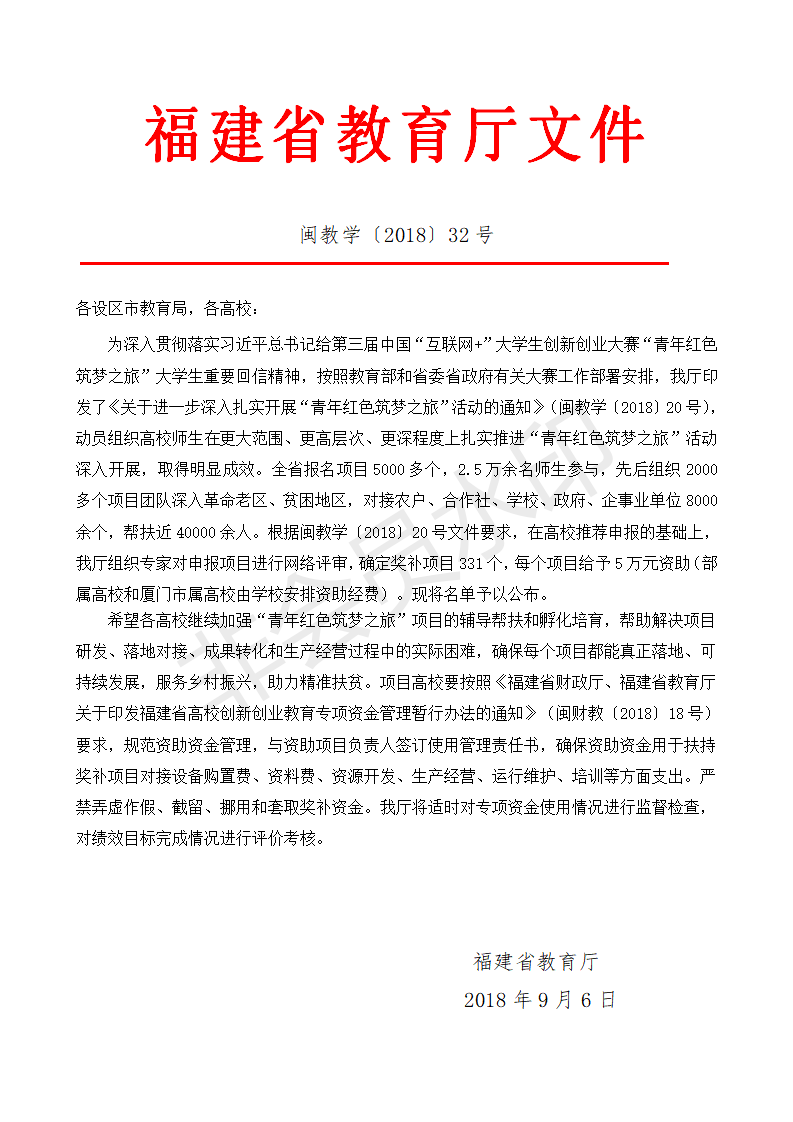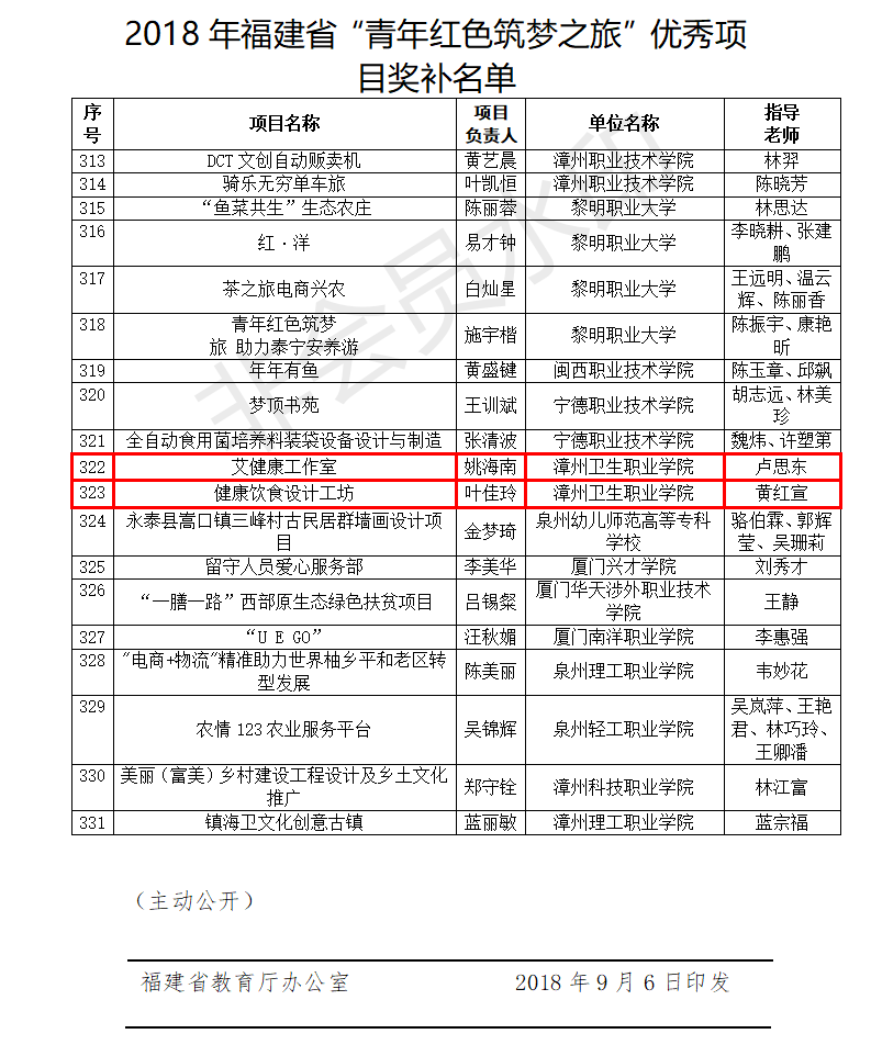 根据闽教学〔2018〕32号文件,我院创新创业项目《艾健康工作室》、《健康饮食设计工坊》自全省5000多个参赛项目中脱颖而出,荣获2018年福建省“青年红色筑梦之旅”优秀奖补项目。