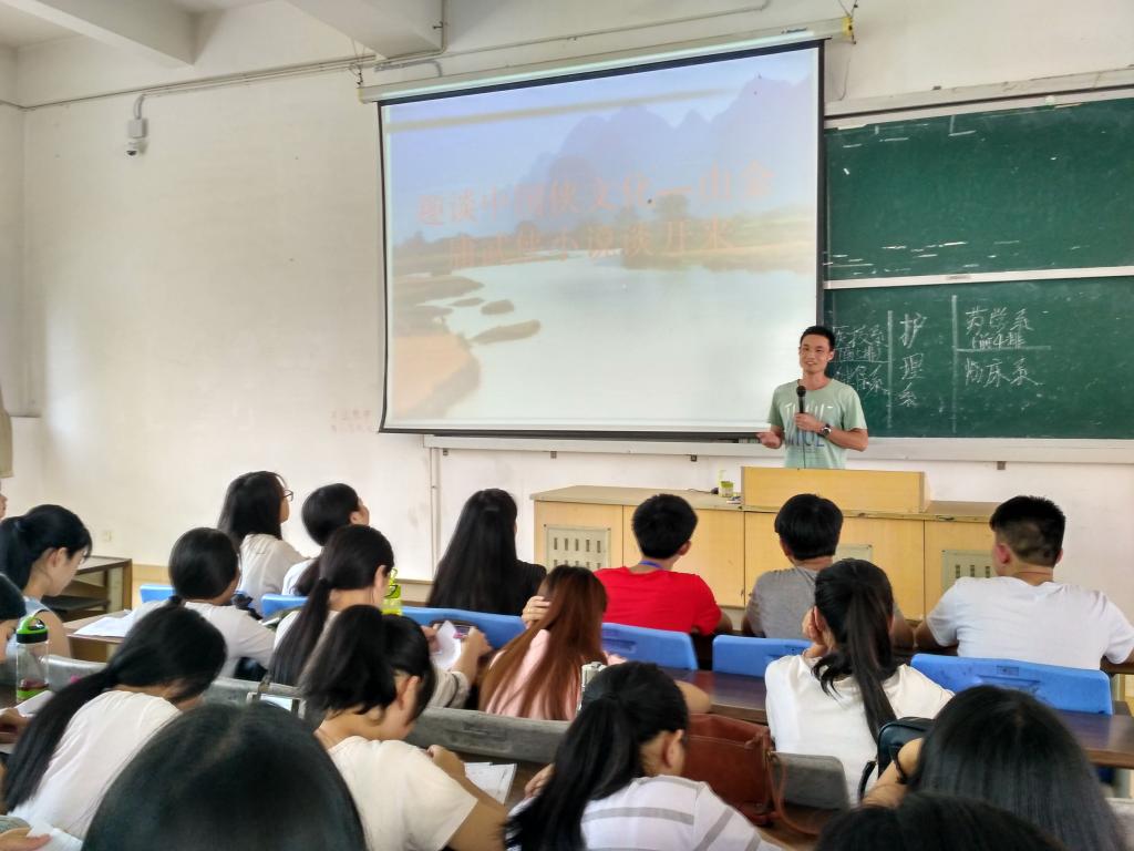 为加深同学们中国特有文化的理解,拓宽其学习生活新理念,5月23日下午,我院在明德楼五教开展“趣谈中国侠文化—由金庸武侠小说谈开来”专题讲座,本次讲座由公共基础部田治国老师主讲,近300名学生参加。