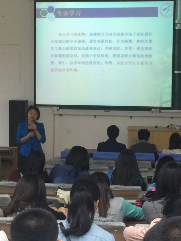 郑丽红老师图文并茂地向大家讲述了与我院合作交流的台湾高校、台湾高校的特色、合作交流的方式及学院2015年秋赴台交流学习计划。随后,林荣金老师及其他四名2015年3月赴台湾元培医事科技大学参加国际性学生学术论文研讨会师生做台湾之旅的经验交流报告,畅谈各自的赴台学习心得。