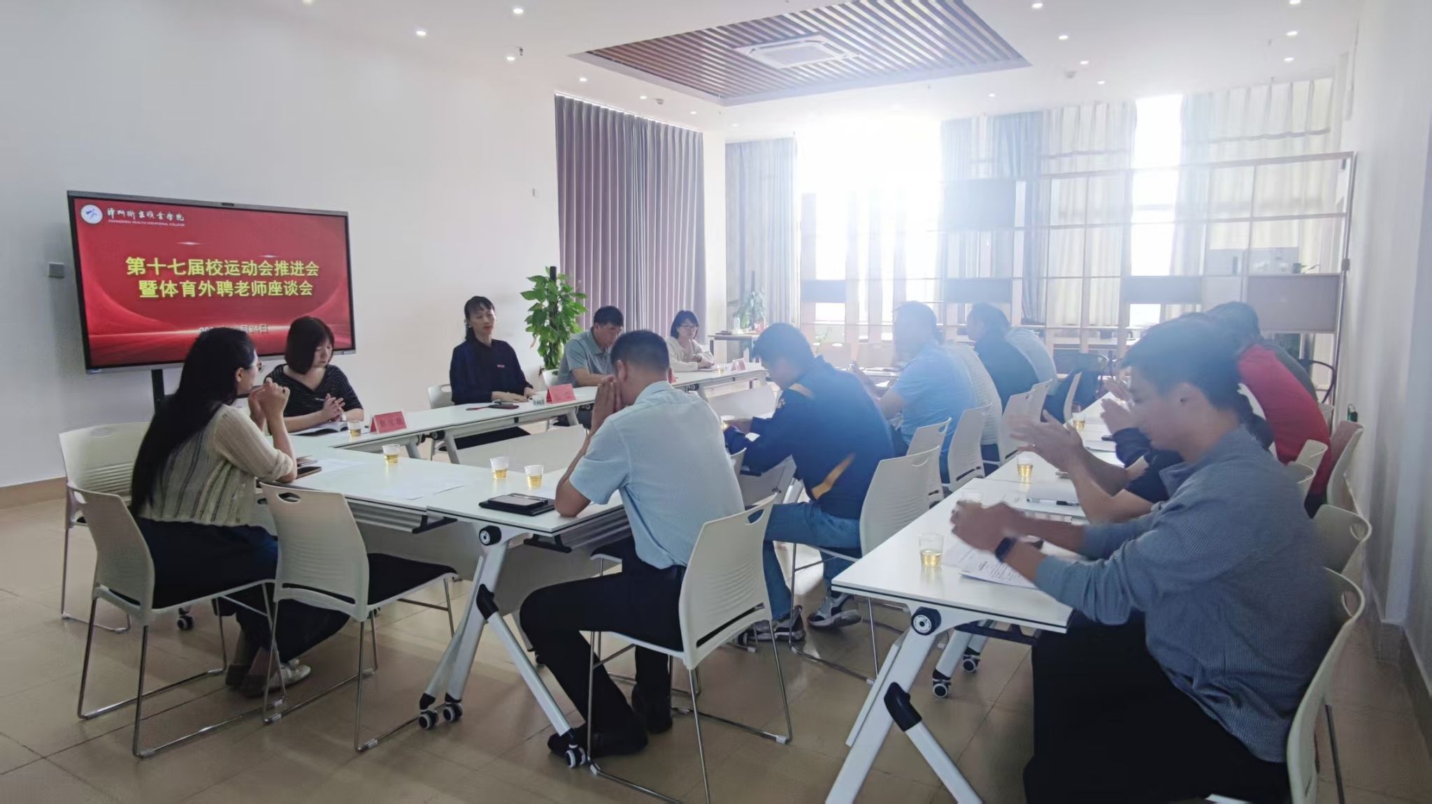2025年10月24日上午,第十七届校运动会推进会暨外聘体育老师座谈会在通识教育学院多功能活动室召开,学院全体行政人员、体育教研室和外聘老师参加会议。