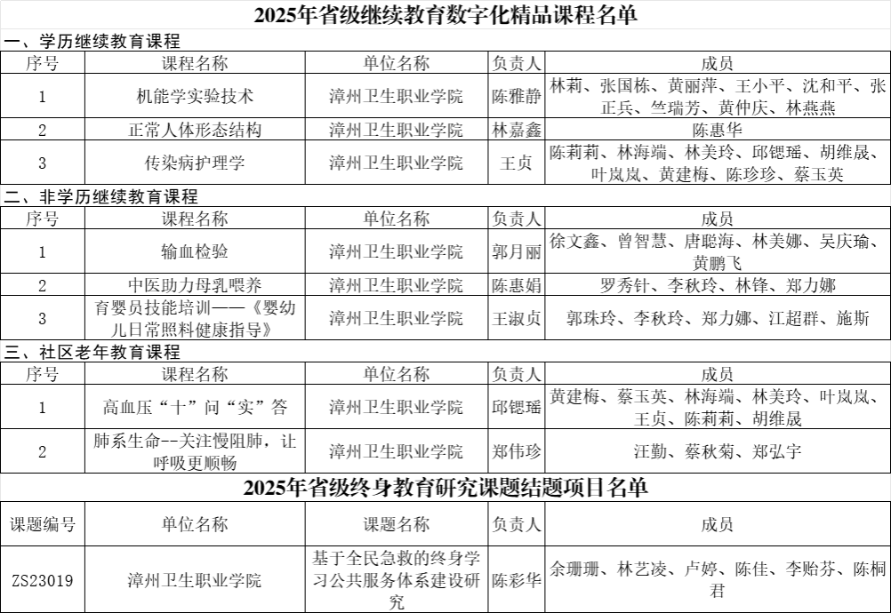 此次 10 项成果入选省级重点项目,是福建省教育厅对我校继续教育教学质量、资源建设水平的高度认可。下一步,学校将以此次立项为契机,加强课题研究与精品课程的落地应用,通过线上平台开放、线下培训推广等方式,让优质资源惠及更多社会学习者;同时,持续聚焦区域产业与全民学习需求,深化继续教育课程体系改革,开发更多针对性强、实用性高的优质项目,不断提升继续教育服务效能,为我省终身教育体系构建、职业技能人才培育贡献漳卫力量。
