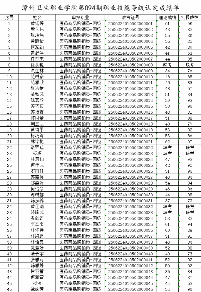 根据福建省职业技能鉴定指导中心关于印发《福建省职业技能等级认定考务实施办法(试行)》的通知有关要求,现将第094期职业技能等级认定成绩予以公示。公示期自2025年6月24日—2025年6月30日,公示期内,如有异议,请及时与我们联系,联系电话:0596-2536181。