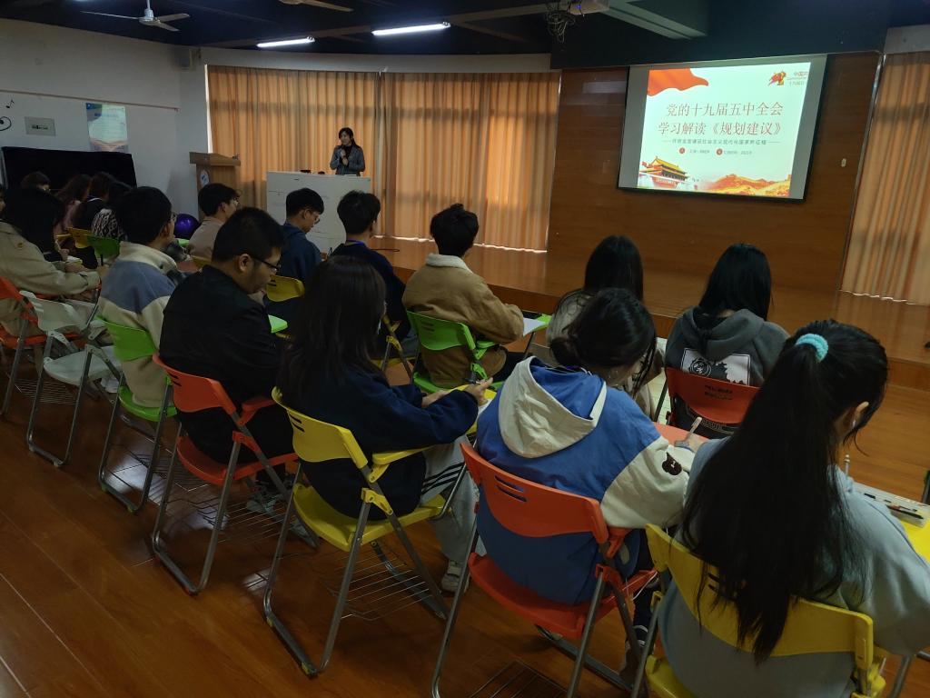 宣讲会上,颜晓萍简要阐述了十九届五中全会的重大意义,全会深入分析了国际国内形势,就制定国民经济和社会发展“十四五”规划和二〇三五年远景目标提出了建议。随后,颜晓萍通过简单而生动的语言,向同学们介绍了十四五规划涉及的十二方面内容,重点讲解了关于国民教育、医疗卫生、就业创业、生态环境、科技创新等跟同学们息息相关的内容,以及2035年远景目标,解读了关于《规划建议》的60个条目和民生领域举措,让同学们对“十九届五中全会精神”有了更加深刻的认识,增强了同学们的专业认同感和归属感,对未来自己的发展方向有了更好的规划。