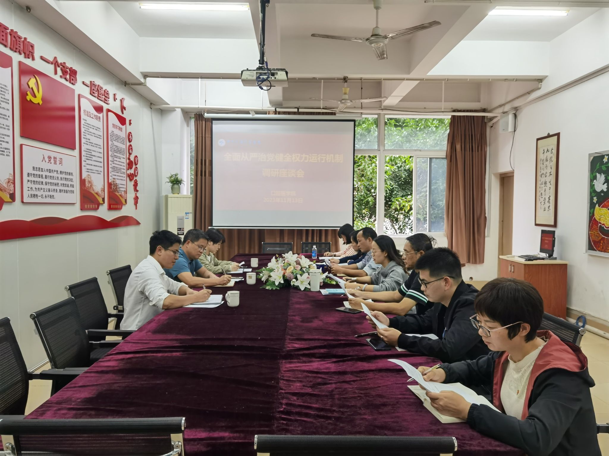 本次调研以座谈交流方式进行,相关二级学院和部门的负责人结合推进全面从严治党健全权力运行机制进行汇报,与会人员参与讨论。宋志海指出,权力的运行一定要有底线思维和红线意识,要敬畏权力,守土有责。强调二级学院在招标采购、评奖评优、入党推优、助学金评定等方面工作要规范程序,做到公开公平公正。强调后勤管理处、人事处等部门,在基建、招标采购,职称评聘、人才引进、绩效分配等重点领域、关键环节决不能疏忽大意,要严细结合,秉公办事,让权力在阳光下运行。