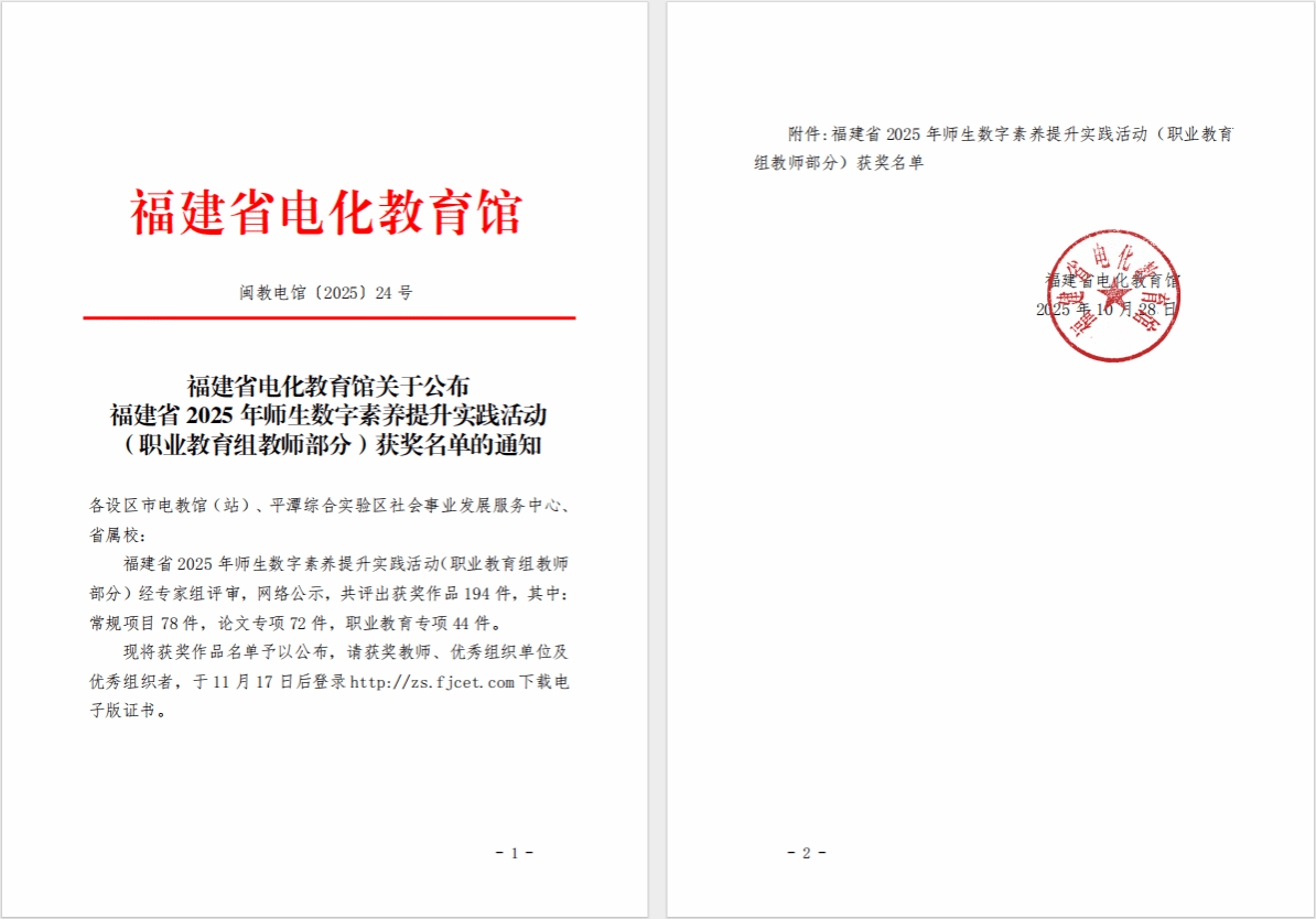 近日,福建省2025年师生数字素养提升实践活动获奖结果揭晓,我校申报的9个项目中共有5项获奖取得优异成绩,分别是一等奖1项、二等奖1项、三等奖3项。