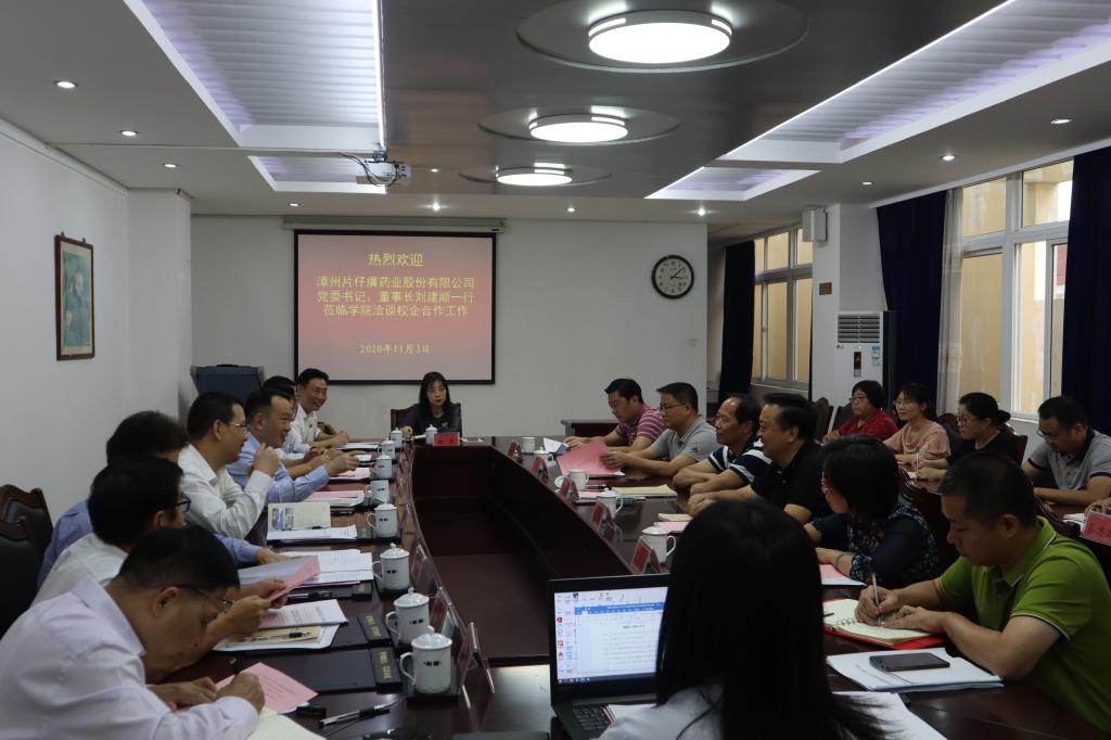 11月3日下午,漳州片仔癀药业股份有限公司刘建顺董事长、黄进明总经理率领公司领导班子及相关部门负责人到我院商谈合作事宜,学院党委林忠书记等学院领导热情接待。