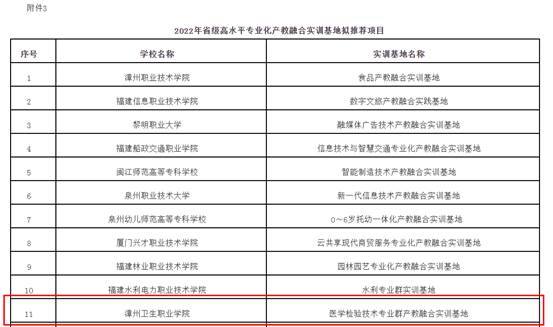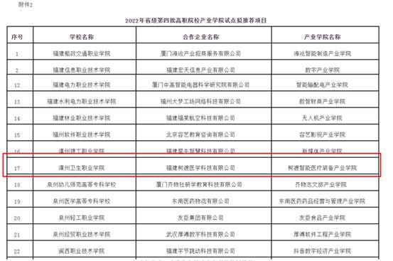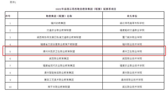 12月14日,福建省教育厅发布《福建省教育厅关于公布2022年省级职业教育重点建设项目的通知》(闽教职成〔2022〕38号)文件,我院申报的漳州市医药卫生职业教育联盟获批为省级示范性职业教育集团(联盟)项目,柯渡智能医疗装备产业学院获批为省级第四批高职院校产业学院试点项目,医学检验技术专业群产教融合实训基地获批为省级高水平专业化产教融合实训基地项目。