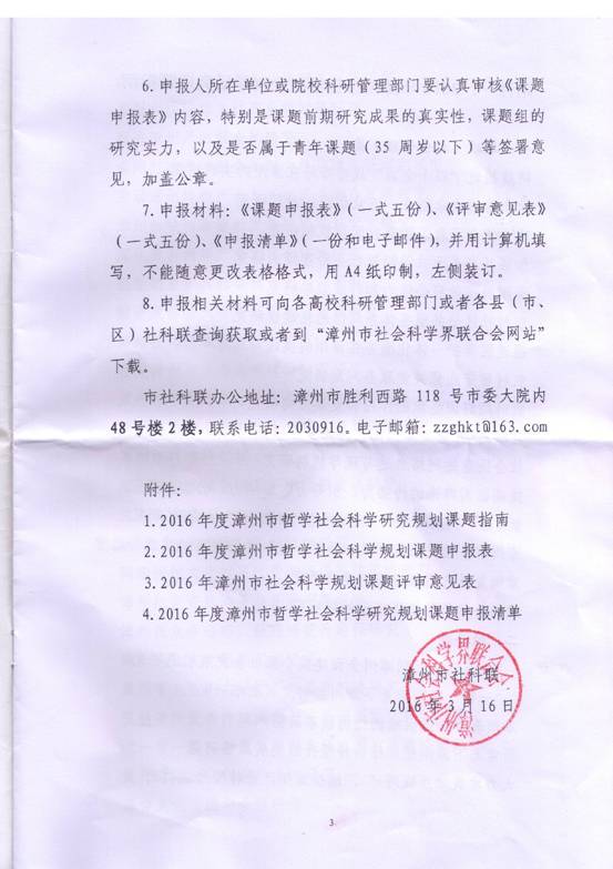 现将关于做好申报漳州市2016年度哲学社会科学研究规划课题的通知漳社科联〔20163号转发给你们,请根据通知要求做好申报工作。项目申请所需材料(《课题申请表》(一式五份)、《评审意见表》(一式五份)、《申请清单》(一份和电子邮件)),可从“漳州市社会科学界联合会网站”下载,请于2016415日前,以系部为单位报送至学院科研科,由学院汇总后统一上报。逾期不予受理。联系电话:0596-2559560