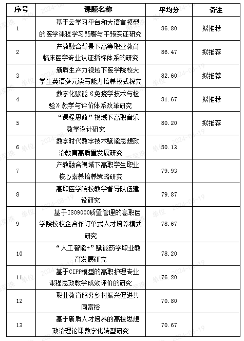 根据《福建省教育科学规划领导小组办公室关于开展常规课题2024年度申报工作的通知》(闽教科规〔2024〕7号)文件要求,至申报截止日期,科技处共收到13份申报材料。科技处根据《漳州卫生职业学院科研项目院内评审办法(试行)》(漳卫职科〔2018〕12号)相关程序对通过形式审查的课题组织评审,现将专家评审结果及拟推荐名单予以公示(详见下表)。