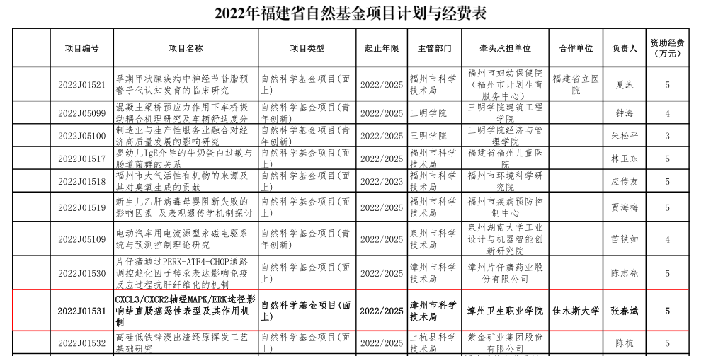 《CXCL3/CXCR2轴经MAPK/ERK途径影响结直肠癌恶性表型及其作用机制》获自然科学基金项目(面上)立项