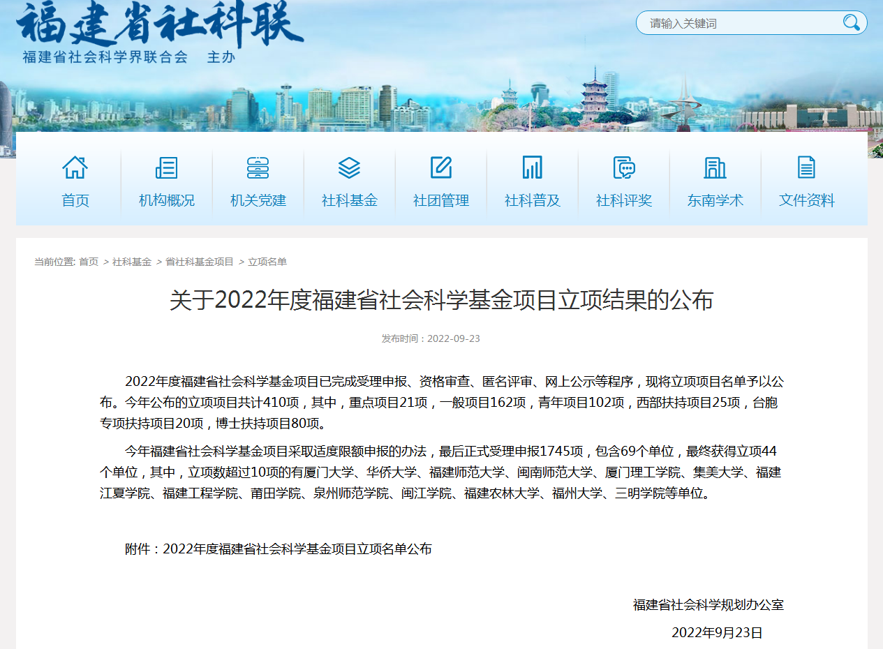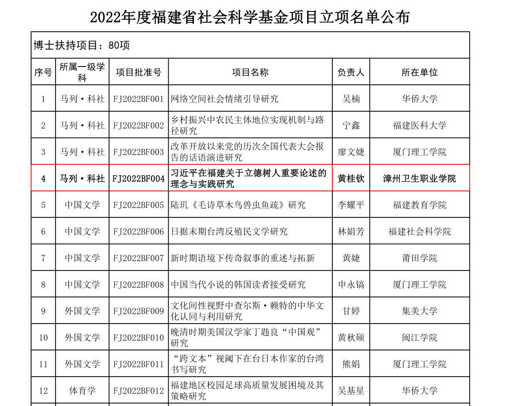 近日,福建省社会科学规划办公室公布2022年度福建省社会科学基金项目立项结果,我院黄桂钦老师主持的《习近平在福建关于立德树人重要论述的理念与实践研究》获博士扶持项目立项。这是今年我院继张春斌教授喜获福建省自然科学基金项目支持后,又在社科领域取得新突破。